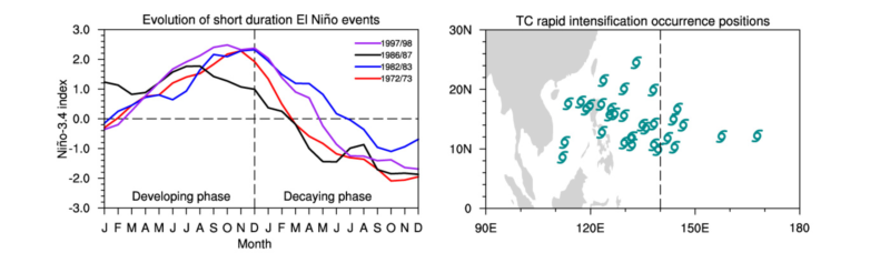 图1. 左图为快速衰减型厄尔尼诺年Ni?o 3.4区域(5°S?–5°N, 120°–170°W)平均海温异常随时间的演变,右图为相应年份台风快速增强开始的位置。