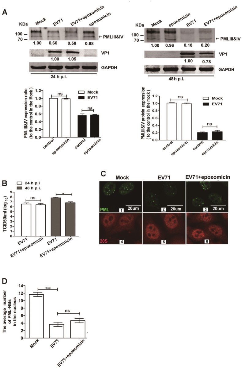 该研究的主要发现:1)在PML敲低或者敲出除的细胞中EV71复制增加;在PML的6种亚型中,PML III和IV被鉴定为对抗EV71的抗病毒而PMLIII或PMLIV的过表达抑制EV71病毒生产。 因此,PML是EV71复制的限制性因子。2)PML通过抑制感染细胞中的自噬来抑制EV71的复制。3)EV71感染诱导PML的降解,不依赖于蛋白酶体途径,而是病毒3C蛋白酶介导PML降解。
