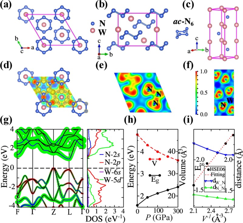 图2. W–N新相结构图和电子结构((a-b):h-WN6 结构图 ; (c):h-WN 结构图;(d-f):h-WN6晶体电子局域密度分布图;(g-i):h-WN6能带结构特点)