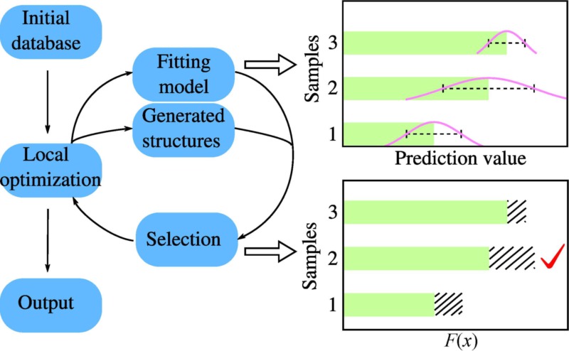 图1. 机器学习加速晶体结构预测方法的流程图(左半图显示贝叶斯优化过程,右半图模型选择策略)