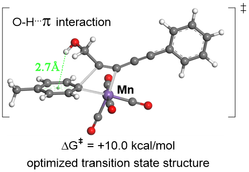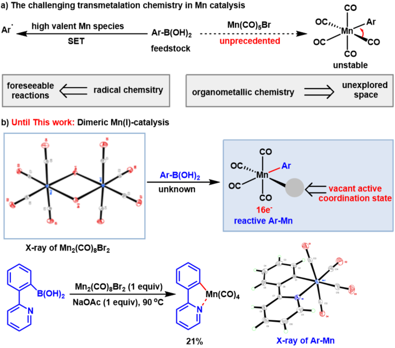 芳基硼酸具有特异的反应活性、稳定性、易得性、易操作性,是一类非常重要并有着广泛合成应用的芳基源。由于非螯合的多羰基芳基Mn化合物活性非常高,容易发生分子内的配体迁移重排反应;而高价Mn催化剂容易与芳基硼酸发生单电子氧化形成相应的芳基自由基。因此,Mn催化的芳基硼酸在有机合成中的应用仍然是Mn催化领域的一大挑战。化学化工学院分子与材料合成研究团队提出了通过桥连双核Mn催化产生更高活性的空配位的芳基锰物种,直接与1,3-共轭双炔快速配位,完成区域、立体和化学选择性氢芳化反应。该方法为(Z)-构型共轭烯炔的模块化合成提供了一种通用策略,且具有操作简单、官能团相容性好等特点,对各种重要的官能团都具有很好的耐受性。同时,低价锰参与的转金属作用得以证实,课题组成功得到反应中间体的单晶结构验证。通过理论计算,一种基于“O-H…p interaction”的新型定位策略被首次应用炔烃的氢芳化转化。