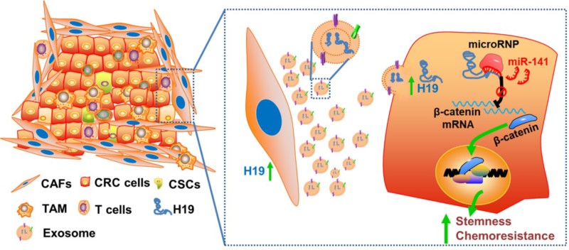 该研究首先利用全转录测序技术分析了诱发性结肠癌模型组织样本,筛选出了差异性表达的lncRNA H19,同时在TCGA数据库中分析了lncRNA H19不同分期的结直肠癌的表达情况,并探究了结直肠癌样本中lncRNA H19表达与结直肠癌干性相关性。通过体内外实验确认了lncRNA H19对结直肠癌干细胞干性和奥沙利铂耐药性的促进作用。进一步发现CAFs中高表达lncRNA H19并且能够通过外泌体转移lncRNA H19到结肠癌细胞。深入探究分子机制发现lncRNA H19通过竞争性吸附miR-141的方式活化结直肠癌Wnt /β-catenin通路,进而促进结直肠癌细胞的干性和耐药性。