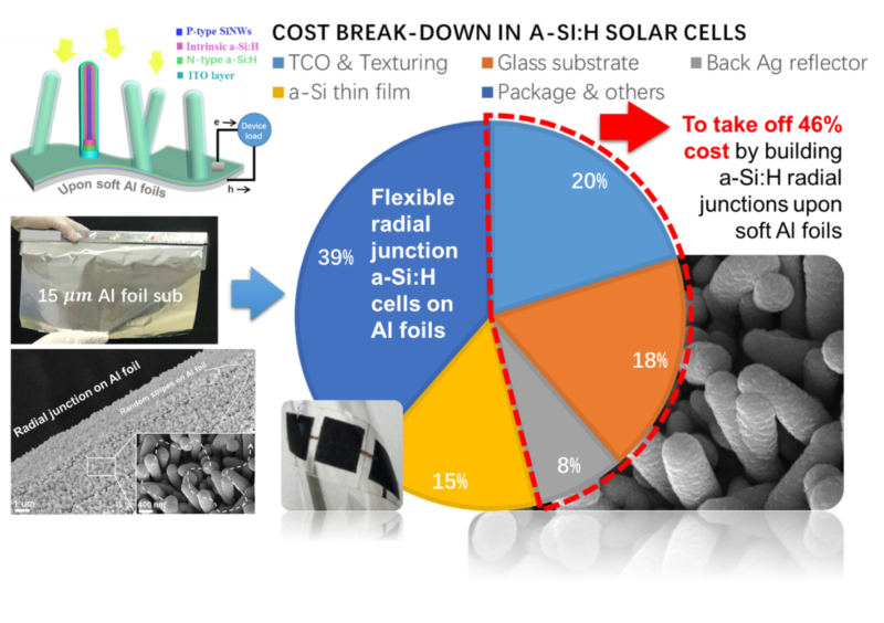 此项研究工作利用低熔点金属(锡Sn)催化的低温“气-液-固”(vapor-liquid-solid, VLS)生长技术,首先在柔软的铝箔表面生长“竖直站立的”硅纳米线阵列,作为三维(3D)框架。然后,在纳米线上利用PECVD淀积制备非晶硅径向结电池结构(如下图所示)。如此,在利用3D构架获得高效陷光效应的同时,也将有效光电转化结构与高应力、不稳定的铝箔表面实现有效分离和“应力隔绝”。从而确保径向结区在电池衬底高弯曲情况下不受破化,并保证持续稳定的光电转换输出。同时,由于分立纳米线在软铝箔表面所形成稳固锚(anchor)接触,对表面淀积的薄膜起到了关键的稳定作用,避免了薄膜在受力时发生剥离和破裂,解决了在如何在力学特性不稳定的“软”铝箔基底上,构建高品质、稳定光电转换结构的关键技术问题。基于此新型3D径向结光电构架,本工作首次直接在超薄商业铝箔衬底之上,成功制备超柔性非晶硅薄膜电池( 5.6%, Voc=0.71V,Jsc=14.2 mA/cm2),可弯曲至曲率半径小于<5 mm,以及优异的功率质量比特性PTW=1300 W/kg(是目前薄膜电池的4~10倍)。更为重要的是,由于在导电性很好的铝箔衬底上直接完成电池结构的制备,可省去对底层光伏玻璃衬底、TCO薄膜和银反射层的需求,从而砍掉薄膜电池近一半的制备成本,为进一步降低光伏应用成本,提升柔性电池功率/重量比,推广新型高效柔性、可穿戴电子器件应用指示一种全新的技术路线。