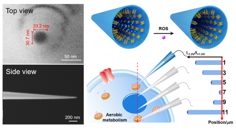 最近,课题组采用尖端直径仅为30nm的石英毛细管,进一步提升单细胞分析的时空分辨能力,建立起一种可在亚细胞水平上实时监测单细胞氧化还原代谢的电分析方法。在石英纳米孔道内精确自组装G-四链体DNA酶,通过分析离子电流的变化,监测单细胞内氧化还原代谢产生的活性氧;结合微操作定位系统,这种超微纳米毛细管可在单细胞内精准定位,实现了亚细胞水平的分析。该方法成功揭示了单细胞在氧化应激反应中以及药物刺激作用下有氧代谢水平的变化。该研究工作发表在Angewandte Chemie International Edition (2018, 10.1002/anie.201808537)上。化学化工学院博士生宋娟与徐琮辉副研究员为论文共同第一作者,赵微副研究员和徐静娟教授为论文共同通讯作者。