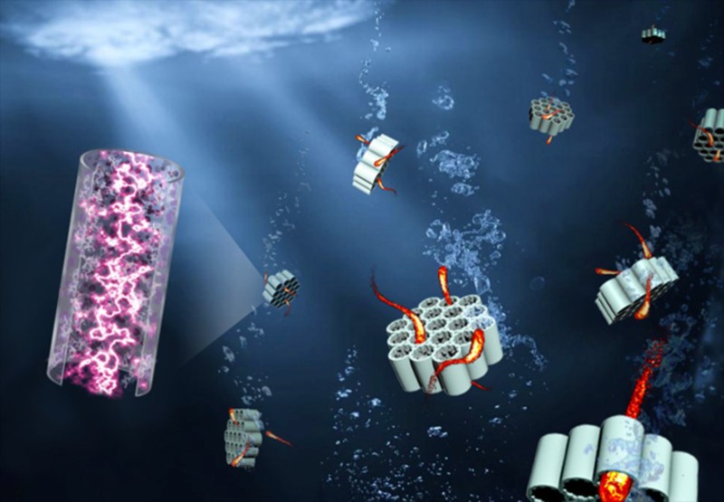 研究团队首先通过DFT理论计算和实验发现了层状氮化碳材料[C(CN)3]具有半金属性,接着利用多孔AAO结构作为材料生长模板,使得小尺寸的氮化碳纳米薄片附着在人工纳米多孔管阵列中增多暴露的活性位点,同时构建了一种特殊的光学微腔共振光栅结构增强对太阳光的吸收。此外,这种设计还有利于催化剂的便捷回收。