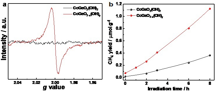 图1.(a)EPR分析显示光辐照产生氧空位与邻近的羟基生成受阻路易斯酸碱对。(b)产物检测分析显示路易斯酸碱对明显提升CO2催化生成CH4的速率。