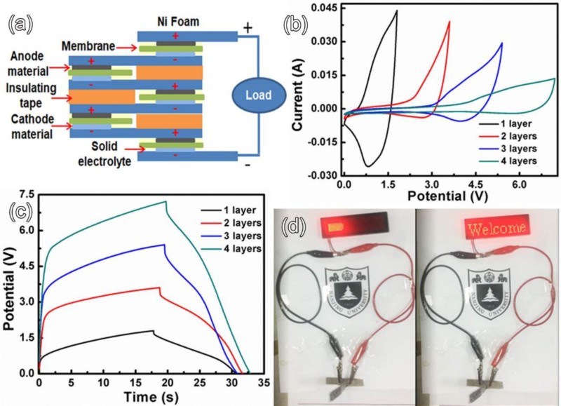图2.(a)非对称全固态器件的串联设计示意图;(b)不同叠加层数器件的CV曲线;(c)不同叠加层数器件的GCD曲线;(d)3个串联器件给LED灯牌供电。