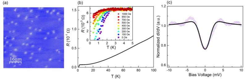 图1(a)KxWTe2的STM表面形貌图。(b)钾插层WTe2的电阻随温度变化曲线。插图:在不同的外加磁场(H⊥)下的电阻随温度变化曲线。(c)KxWTe2样品表面测量的扫描隧道显微谱显示超导能隙的存在。