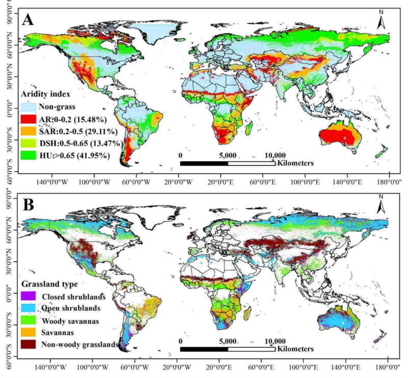 图1. 全球草地分布气候区界定(A)及草地类型分布(B)。