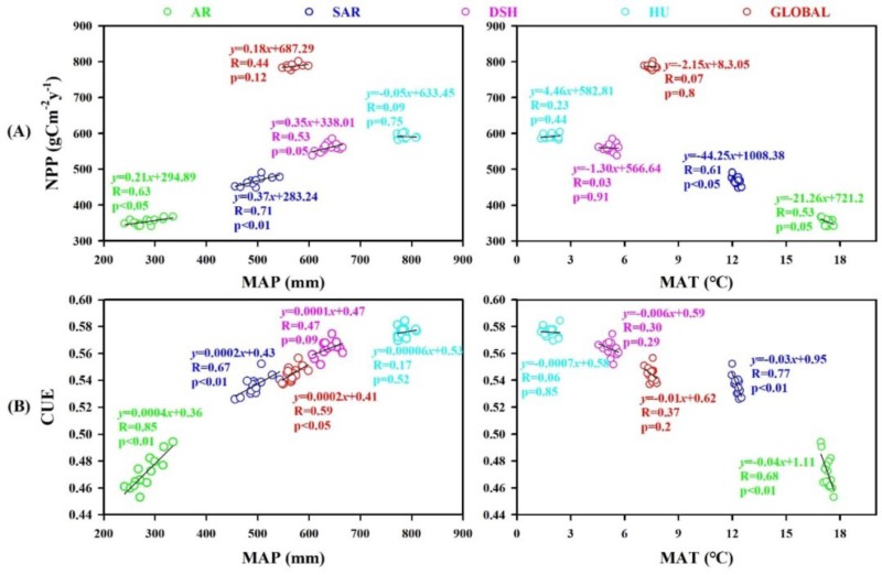 本研究结果表明:除AR之外,其他气候区草地NPP和CUE均呈现轻度增加趋势。草地NPP和CUE在不同的气候区表现出明显的空间异质性。草地NPP的高值区主要分布在南半球的DSH和HU,原因在于该部分地区气候温暖湿润,草地光合能力较强且土壤有效水分较高,利于草地NPP的积累。草地CUE的高值区主要分布在北半球的HU。此外,草地NPP和CUE的低值区主要集中在全球的AR和SAR,原因在于该部分地区气温高,降水少,干旱对草地生长的胁迫增强,且草地植被的生物活性及呼吸作用强,造成草地CUE偏低,且不利于草地NPP的积累。对于不同气候区而言,草地NPP和CUE由大到小依次为:HU > DSH > SAR > AR。对于不同草地类型而言,高的NPP值对应高的CUE值,且NPP和CUE由小到大依次为:Savannas < woody savannas < closed shrublands < non-woody grasslands < open shrublands。总体而言,全球草地npp、cue与年平均降水(map)呈正相关,与年平均气温(mat)呈负相关关系。然而,这种关系会随着区域水热条件的差异发生变化。具体看来,草地npp与map在ar和sar呈正相关关系,而在hu呈负相关。草地npp与mat之间的正相关关系仅存在于hu。在各个气候区内,草地cue与map均呈正相关,而与mat呈现负相关关系。此外,随着干旱梯度由ar至hu的变化,草地cue与map的相关系数逐渐减小,表明降水与ar/sar的cue增加有重要关系,而这种关系在hu将变得不明显(图2)。