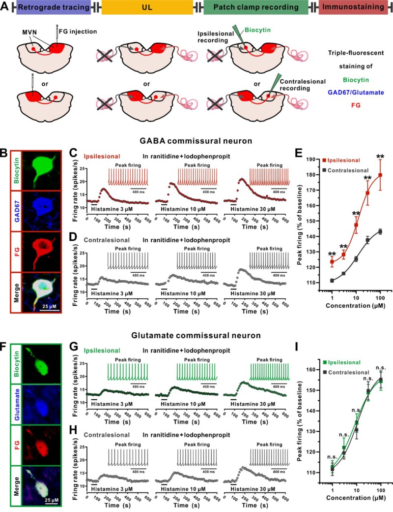 朱景宁、王建军课题组的该项研究揭示中枢前庭核团复合体中的组胺H1受体对前庭代偿具有重要贡献。阻断前庭内侧核(medial vestibular nucleus,MVN;中枢前庭核团复合体中最重要的亚核)中的组胺H1受体可极大地延缓前庭损伤后静态症状(如头部倾斜、姿势失衡和眼球震颤)和动态症状(行走异常和运动失调)的代偿与恢复。单侧前庭损伤后,损伤侧MVN中投射至对侧的GABA能神经元上的组胺H1受体的表达选择性地升高,而健侧没有改变。由于前庭症状产生的根本原因是双侧前庭中枢活动的失衡(损伤侧MVN活动降低而健侧MVN活动升高),组胺H1受体的这一选择性表达升高可使其介导的组胺的兴奋性效应在损伤侧MVN中投射至对侧的GABA能神经元上显著增强(图1),进而通过双侧MVN间的连合抑制系统(commissural inhibitory system)抑制对侧(健侧)过度兴奋的MVN神经元(图2),从而有助于双侧前庭系统平衡的恢复和前庭功能的代偿。值得注意的是,临床上用于治疗前庭疾病的经典药物betahistine一直被认为通过作用于突触前组胺H3受体发挥作用,而朱景宁、王建军课题组的工作揭示了突触后组胺H1受体也参与介导了betahistine对前庭代偿的促进作用。