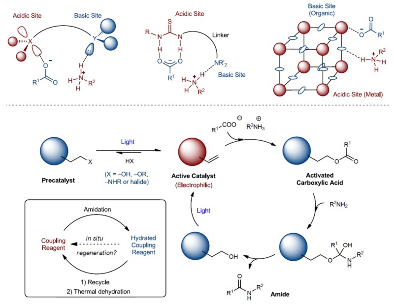 Nature Catalysis近日刊登了化学化工学院王晓课题组题为“Challenges and Outlook for Catalytic Direct Amidation Reactions”的长篇前瞻性文章(Comment)(Nature Catalysis 2019, 2, 98-102; https://www.nature.com/articles/s41929-018-0215-1)。王晓副教授为文章通讯作者,以先导实验为基础,创造性地首次提出了七类可能的解决途径,包括十余种具体方案,期待为未来该领域实现突破指明方向。文中提出的新方案包括:两性硼酸酯类FLP催化剂、仿生MOF催化剂、硫脲-胺催化剂、可见光促进再生的偶联试剂、以脂为中间体的策略、氨基酸的CO2捕捉-NCA策略、催化固相多肽合成、连续流动催化酰胺化等。