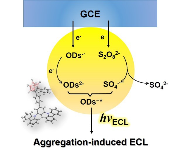 聚集诱导电致化学发光(Aggregation-Induced Electrochemiluminescence, AIECL)是近年来发展的一种将具有聚集诱导发光(AIE)性质的材料应用于电致化学发光的方法,特别是在固相及水相检测中。电致化学发光(ECL)相对于光致发光(PL)具有检测限低,灵敏度高、适用性广等特点,应用前景广阔。目前,大多数已发表的具有AIECL性质的材料大多属于阳极ECL,包括Pt配合物、Ir配合物、有机小分子、高分子纳米材料等,而应用于阴极ECL的材料仅限于量子点,如CdS、CdSe、ZnS等,但其高毒性、高污染性限制了其在生物检测中的应用。因此发展新型无毒的具有生物相容性的阴极ECL材料十分必要。