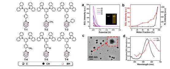近期,化学化工学院燕红课题组设计合成了一系列D-p-A结构的碳硼烷基咔唑类衍生物,与徐静娟课题组合作测试其ECL性能,得到了能有效应用于pH 7.4磷酸缓冲溶液的阴极AIECL材料。通过测试对比不同水含量条件下的PL及ECL,观察到随着水含量的增加,相应的光致发光量子产率不断提升,具备了AIE的性质,同时,随水含量增加,形成的纳米颗粒粒径不断减小、形貌也从表面光滑的球形变成了多孔疏松结构使得其ECL效率在水含量95%的条件下极大提高,至此确定了碳硼烷咔唑衍生物具备阴极AIECL的性质(图1)。