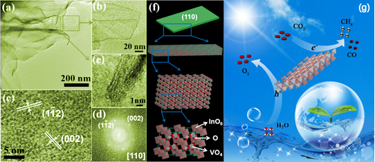 图 (a) InVO4超薄纳米片的透射电镜图像,(b)部分放大细节图,(c) 平铺面的高分辨电镜图,(d)相应的傅里叶转换图,(e) 侧面的高分辨电镜图,(f)纳米薄片的晶体模型, (g) 太阳能光催化转化CO2示意图。