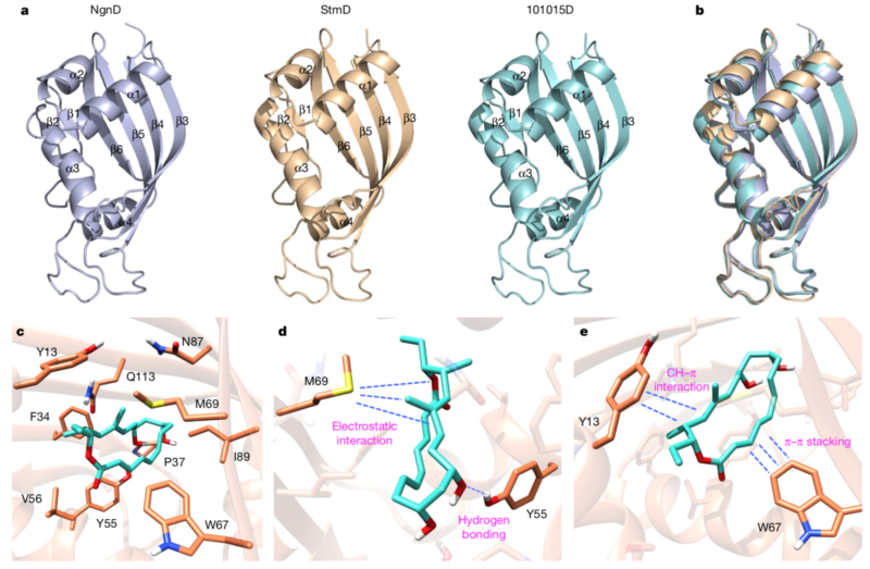 最后,研究者获得了StmD、NgnD和101015D三个蛋白的晶体来进一步研究该反应的催化机理。通过分子对接、计算机模拟和点突变实验,阐明了此类新型环加成酶的反应机制。M69中富含电子的硫原子会特定的指向过渡态中部分带正电的双烯部分,从而产生有利的静电作用;同时反应物中部分带负电的三烯酯会与W67上的芳香环产生π–π堆叠相互作用,来稳定过渡态并加速整个反应的进行。此外,Y55和Y13也会通过分子间氢键和CH–π相互作用来催化反应。