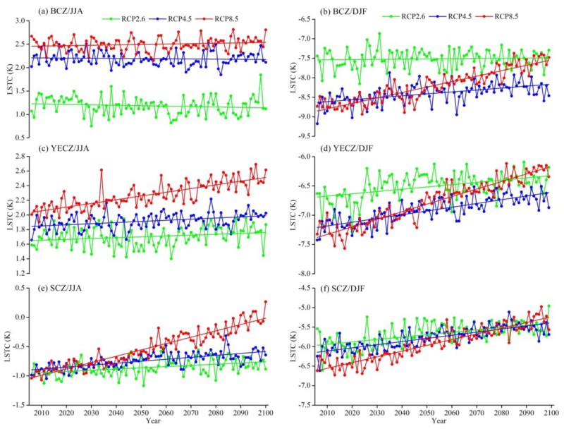 图2:在RCP2.6,RCP4.5和RCP8.5情景下,陆-海温差变化趋势