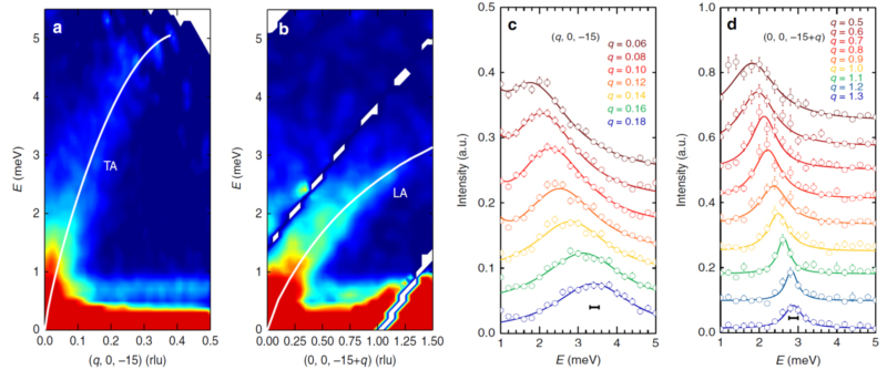 图1. a和b,中子散射实验中在倒空间布拉格峰(0, 0, -15)处分别沿着 [100]和[001]方向的声子谱,TA和LA分别代表横声学支和纵声学支声子。c和d分别对应于a和b中在不同动量q处声子色散在能量上的变化。