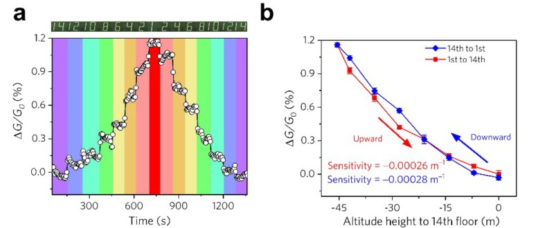 作为实际验证,课题组进一步将压力传感器应用于不同海拔高度的气压变化的测量,在一栋14层的楼房电梯中,实时记录传感器随不同楼层变化的响应。实验表明,传感器能够分辨1 m的海拔高度差引起的气压变化。作为气压高度计,该传感器能够达到0.00027 m-1的灵敏度(图2)。这种超高分辨的气压高度计在航空航天、三维全球定位系统中有着重要的应用前景。