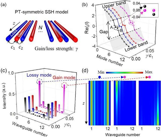 (a)非厄米PT对称的SSH模型;(b)能带和(c)边界态场分布随非厄米调制γ/c1的演化;(d)准零模和严格零模演化图。