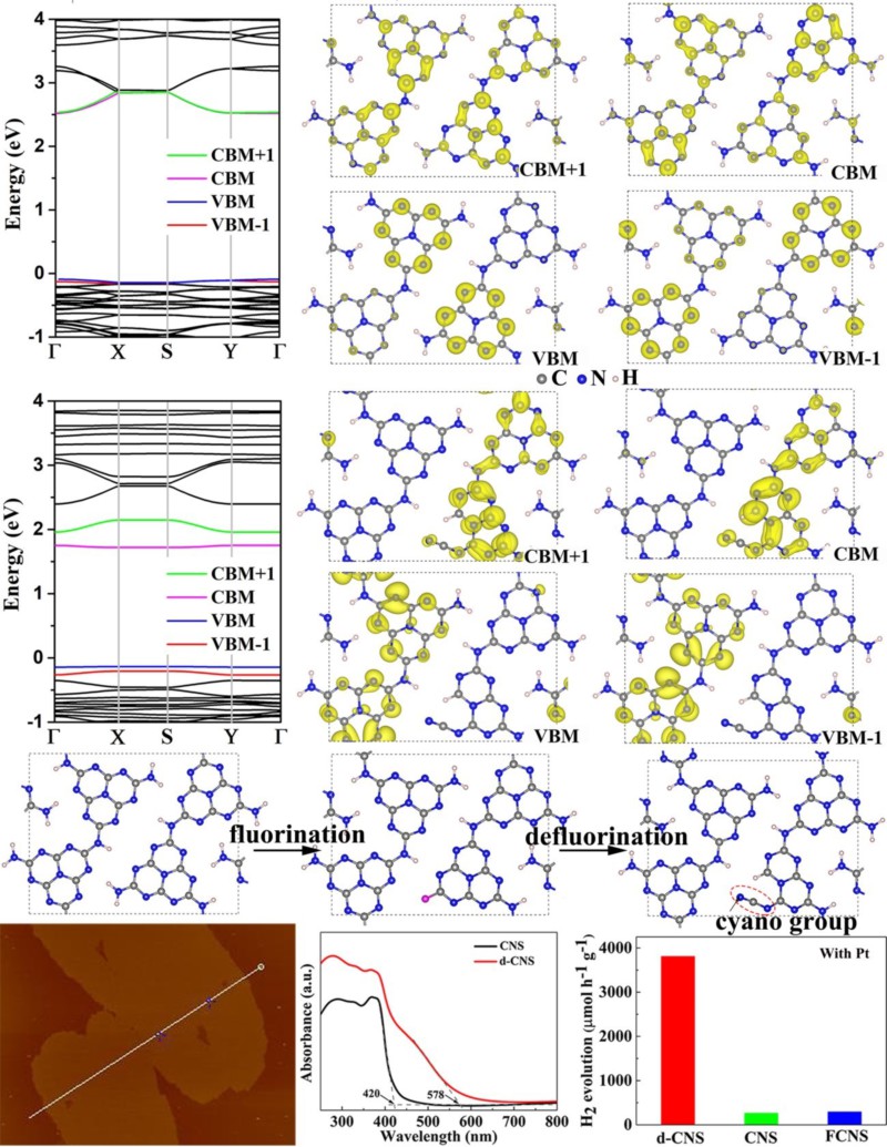 该团队前期首创了低维碳材料的超掺杂技术,即首先对低维碳材料进行氟化后再进行热退氟处理,利用退氟带走碳原子而产生的碳空位实现了轻质元素的超掺杂,并最终实现了近室温铁磁性的氮超掺杂石墨烯(Nature Communications 7,10921,2016)。该团队借助于该氟化热退氟工艺,通过先轻度氟化氮化碳[F/(C+N)%=2.04%]后再热退氟处理后发现:热退氟后能在原子级二维碳氮中引入少量的氰基,其带隙从3.06 eV能有效窄化到2.86 eV。该团队通过理论计算证实:氰基的引入能有效窄化其带隙,并改变其表面的电荷分布。最后,该团队演示了氟化退氟使得该材料的见光光催化产氢性能从262.43显著提升到3809.6 mmol h-1g-1的应用实例。该成果以《Increasing solar absorption of atomically thin 2D carbon nitride sheets for enhanced visible-light photocatalysis》为题发表在(Advanced Materials 31, 1807540,2019)上。物理学院2017级博士生王勇为论文第一作者,汤怒江教授和中国科学院金属所刘岗研究员为论文共同通讯作者。以上研究得到了科技部重点研发计划、国家自然科学基金委、科学院、凯发k8官网“双一流建设”课题等的资助。