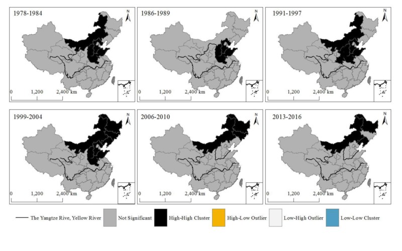 图1.不同时期旱灾对我国典型农牧业生产受灾面积影响的空间集聚性分析结果