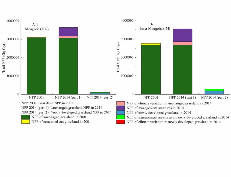 The total grassland NPP of MG (A) and IM (B) in 2001 and 2014, and relative contributions of factors to grassland NPP change.