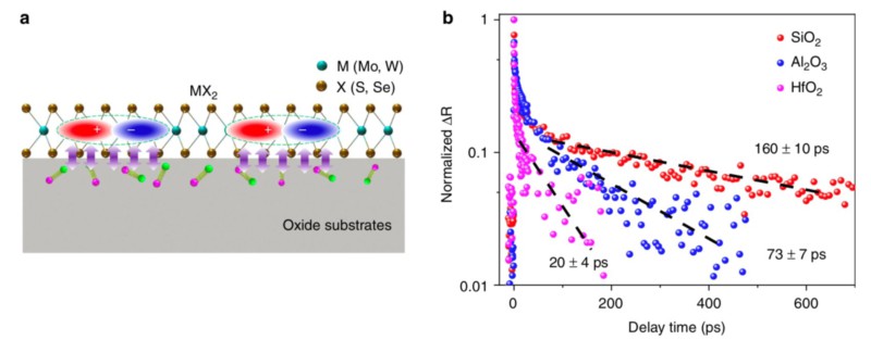 图 1 (a)单层TMD和氧化物衬底间的界面电声子(e-ph)耦合示意图。(b)不同氧化物衬底上的单层MoSe2载流子动力学特征。