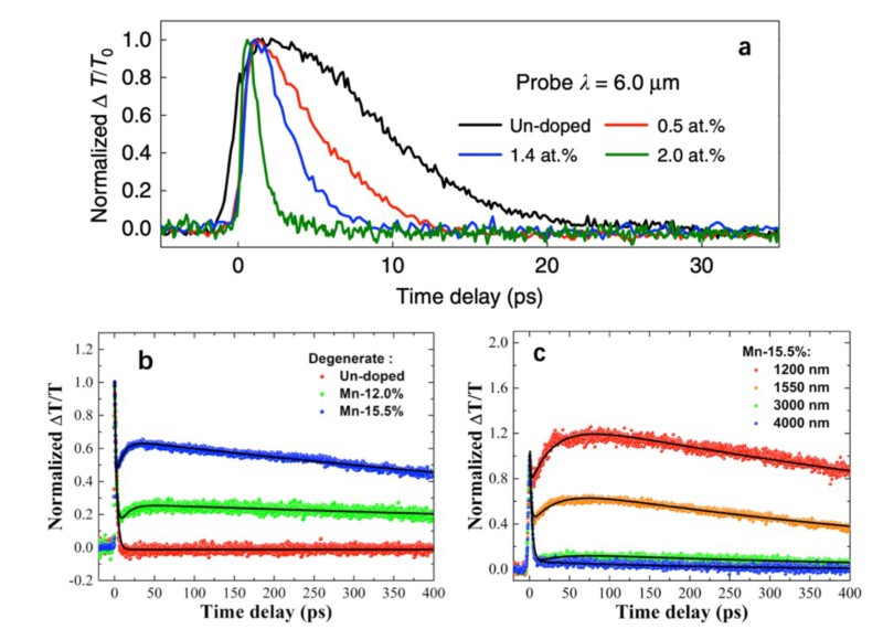 图 3 (a)探测波长6.0 ?m时,不同Cr掺杂浓度下Cd3As2的瞬态透射谱。(b)不同Mn掺杂浓度下Cd3As2的瞬态透射谱,探测波长1550 nm。(d)800 nm泵浦下,掺Mn Cd3As2在不同探测波长下的瞬态透射谱。