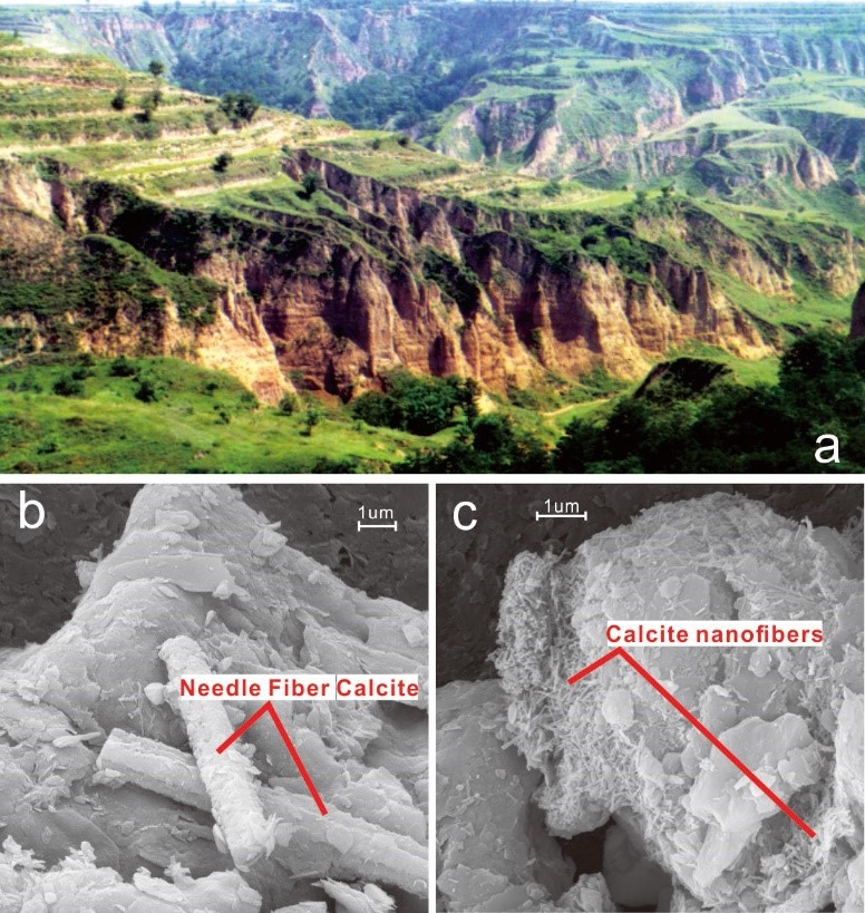图1 洛川黄土-古土壤剖面与成壤碳酸盐形态 (a) 洛川剖面更新世风尘沉积序列,可见颜色深浅交替的黄土-古土壤旋回;(b)-(c) 扫描电镜下古土壤全岩成壤碳酸盐形态