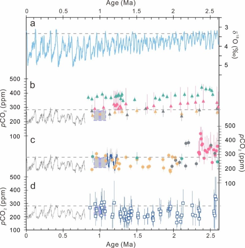 结果显示,早更新世以来pCO2在180~300 ppm间变化(图2d),低于海洋指标记录的200~400 ppm的水平,而与最近发现的南极蓝冰中的pCO2记录一致,表明更新世以来地球气候系统一直在较低大气CO2水平下运行(图2)。研究结果支持大气环流与冰川模型揭示的晚上新世以来北半球大规模冰川的形成需要pCO2低于280 ppm的结论。研究还发现中更新世革命(约1.2~0.8百万年)前后间冰期大气CO2浓度无明显变化。作为关键气候转型期,中更新世革命 (MPT) 标志着冰期-间冰期旋回由4.1万年斜度周期转变为10万年离心率周期,并伴随全球尺度气候变化幅度的增加。中更新世革命的触发机制引起学界广泛讨论,一种主要观点认为更新世以来大气CO2浓度的持续下降导致了MPT的发生,而本研究的结果并不支持这一观点。