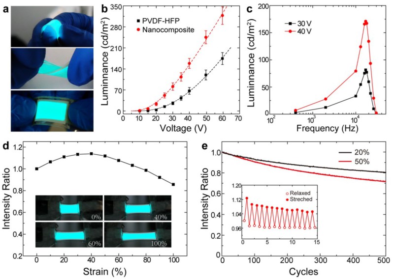针对交流电致发光器件,高介电材料可有效增强电致发光颗粒处的激发电场,提升器件的发光亮度。研究团队以极性热塑性氟橡胶为基材,通过掺入由PVP所修饰的高介电钛酸钡纳米颗粒,从而得到介电常数大于30弹性高介电材料,其最大拉伸应变大于200%。