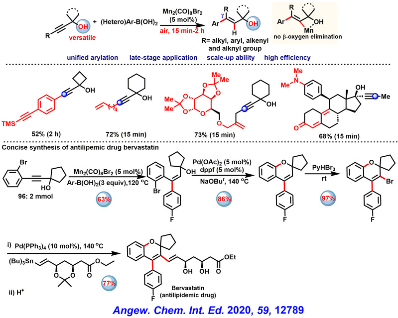 经过系统条件筛选,谢劲课题组发现反应体系中加入一定量的水作为添加剂可以提高反应效率(15 min—2 h),利用炔丙醇自身的位阻效应,改变了反应的区域选择性,成功构建出常规策略难以制备的多取代的叔烯丙醇产物,克服了Pd和Rh等贵金属beta-O消除难题,用廉价金属实现了贵金属难以实现的催化转化(Angew. Chem. Int. Ed. 2020, 59, 12789)。该策略可成功应用于一系列复杂分子的精准后期修饰,不受官能团、取代基和电子效应的影响并可成功应用于Bervastatin药物分子的合成中。