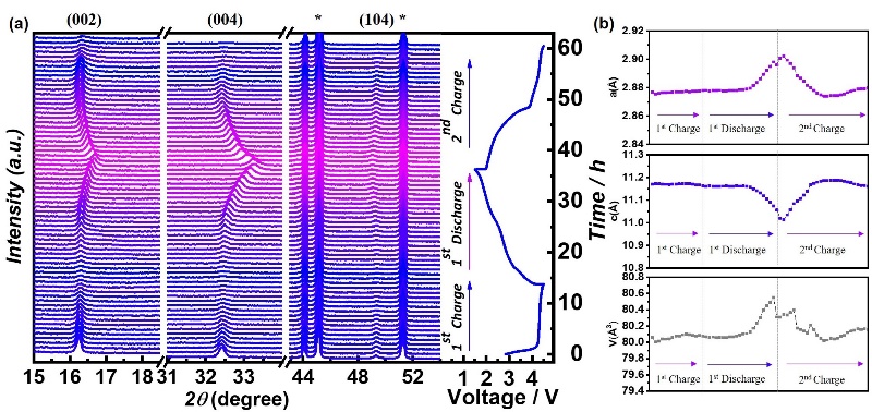 图2 a)首圈和第二圈充电的原位XRD图谱;b)晶胞参数a、c以及晶格体积V的演变