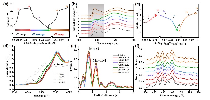 图1 a)充放电曲线及相应反应节点的XAS谱图:b,c)氧元素在不同电化学节点下的K边sXAS谱及阴影部分强度积分变化图谱;d,e)锰元素的K边XANES和EXAFS谱;f)钛元素的L边sXAS谱