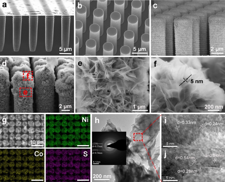 图2.(a)纳米热压印模板界面SEM,(b)柱状Ni微集流体,(c-d)微电流沉积制备的MCo2S4/Ni阵列,(e-g)表面纳米片局部放大SEM,(g)阵列电极的EDS-mapping元素分布图,(h-j)MCo2S4纳米片的TEM、SAED和HRTEM分析。