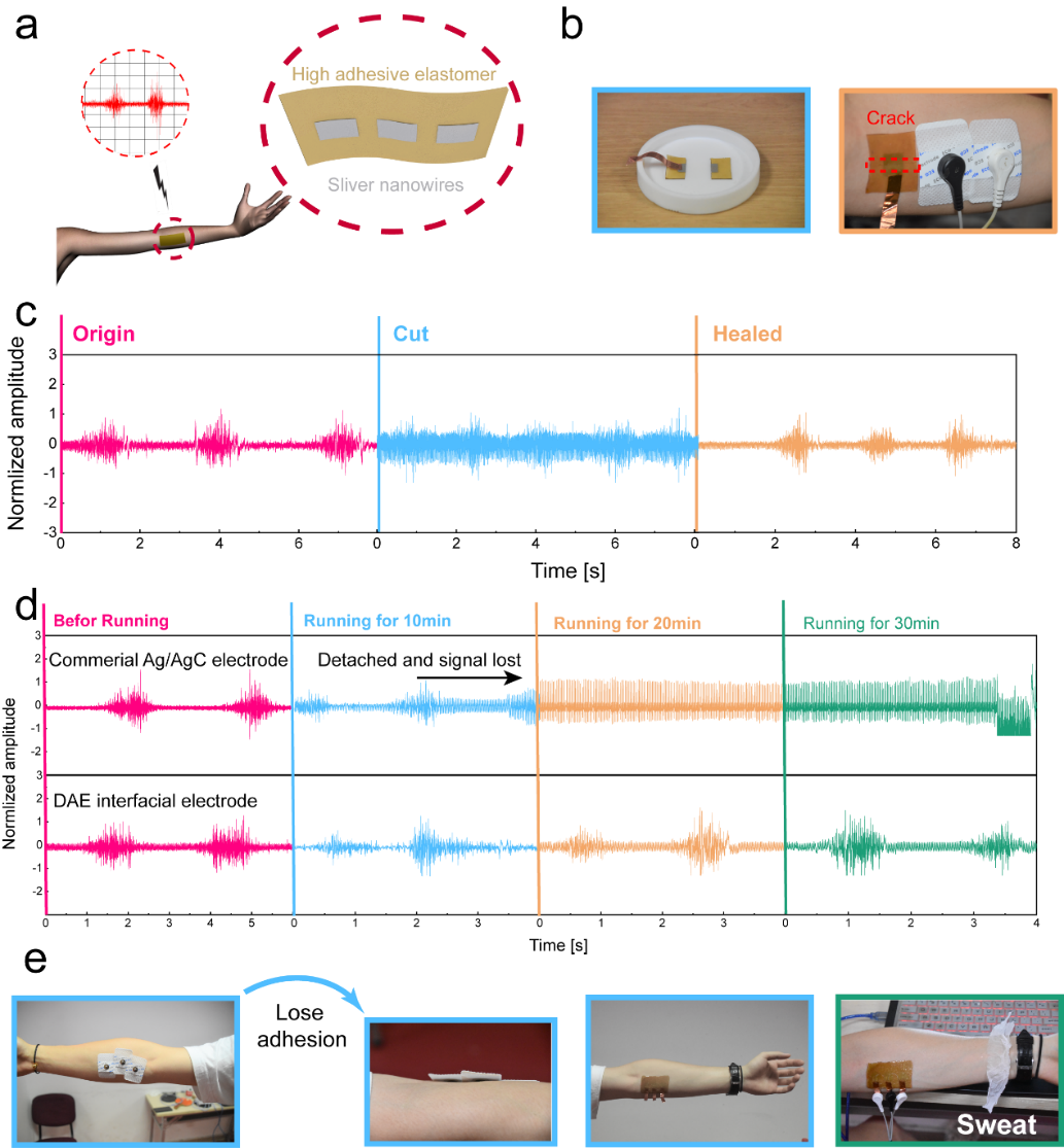 最后,研究人员将电极材料应用于表面肌电信号(SEMG)的测试。"粘"弹性电极材料(DAE)采集到的肌电信号可以与商用凝胶电极相媲美。并且该电极材料切断并修复后仍能对肌电信号进行稳定地采集。如图4d所示,商用的Ag/AgCl凝胶电极在跑步10min后肌电信号出现不稳定并且发生了电极脱落。而DAE电极的强粘附性能保证了材料在汗液存在的条件下仍能保持较强的粘附性能,并且DAE电极在跑步30min后仍能进行有效的肌电信号监测。该研究展示了"粘"弹体材料在生物组织界面电极方面的优势,为解决柔性电子界面粘附性问题提供了新思路。