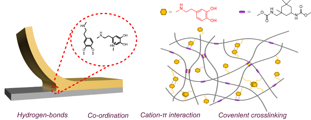 针对这一问题,凯发k8官网化学化工学院张秋红副教授、贾叙东教授课题组将带有二羟基的多巴胺基团引入到以聚四氢呋喃醚基聚氨酯体系中,利用体系内的动态氢键和多巴胺间相互作用,制备了一种新型的"粘"弹体(断裂形变5100%,断裂强度1.9MPa,粘附强度62kPa)。