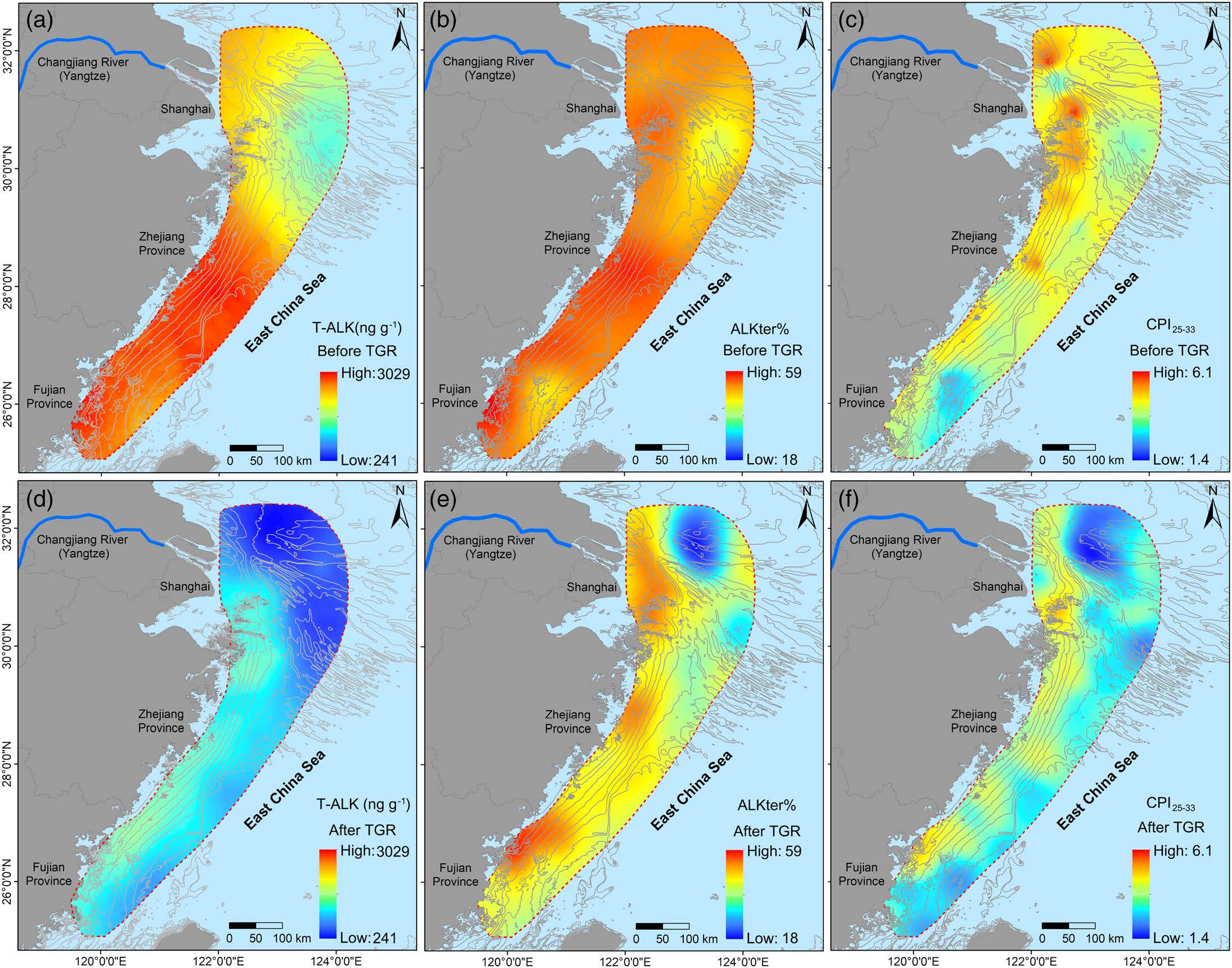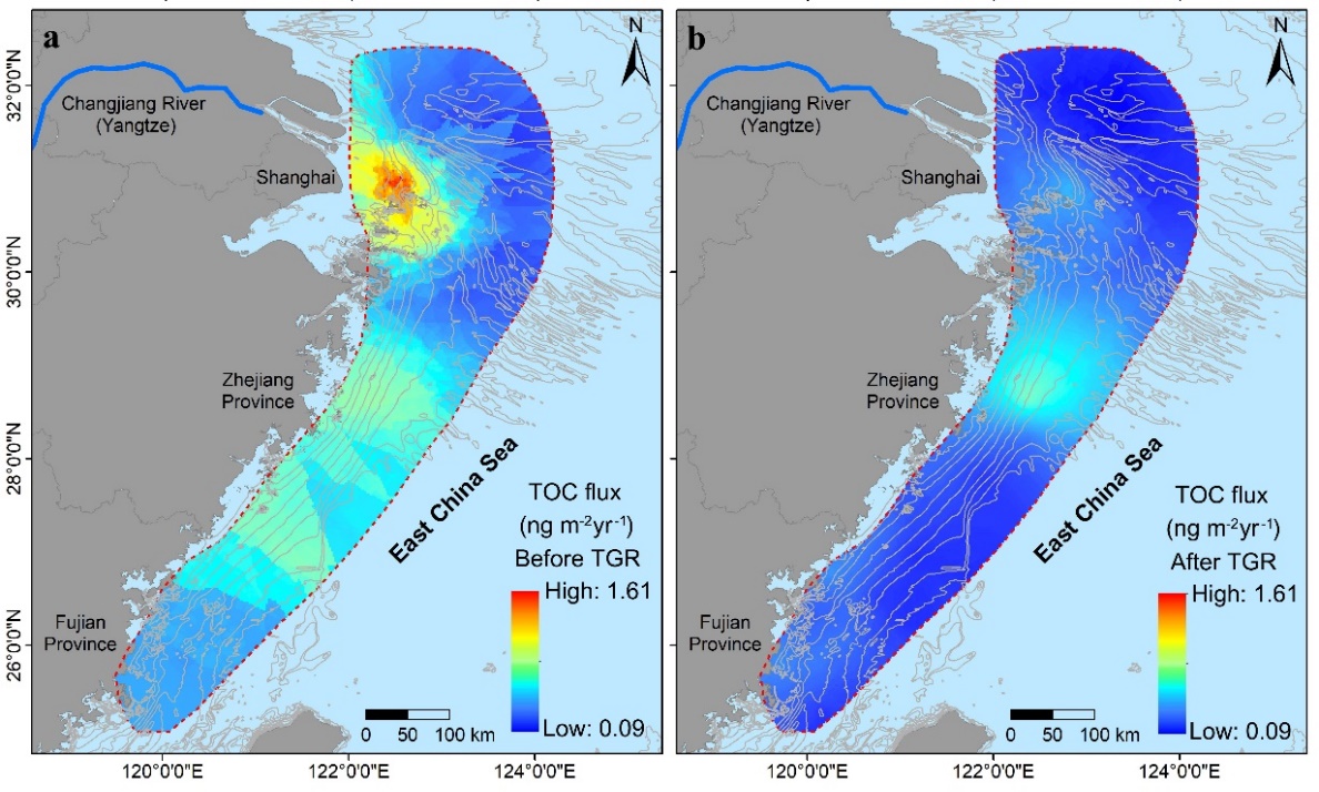 我国东海属于典型的受大河影响的陆架边缘海,长江每年向其输送大量颗粒有机质。巨量陆源物质入海后在长江河口-陆架区形成典型的泥质沉积体,为颗粒有机质提供了良好的埋藏场所。随着流域工程活动不断加剧,长江入海泥沙通量显著减少,并导致长江河口-陆架区的底床沉积物发生再分配,从而可能影响颗粒有机质的输运和沉积过程。地理与海洋科学学院邹欣庆教授团队,围绕这一问题,开展了全面深入的研究,取得了一系列新进展。近期,他们在国外重要学术刊物Geophysical Research Letters, Water Research, Journal of Geophysical Research: Oceans等发表多篇论文,论证流域工程影响下长江河口-陆架区沉积有机质的时空分布变化及其响应机制。