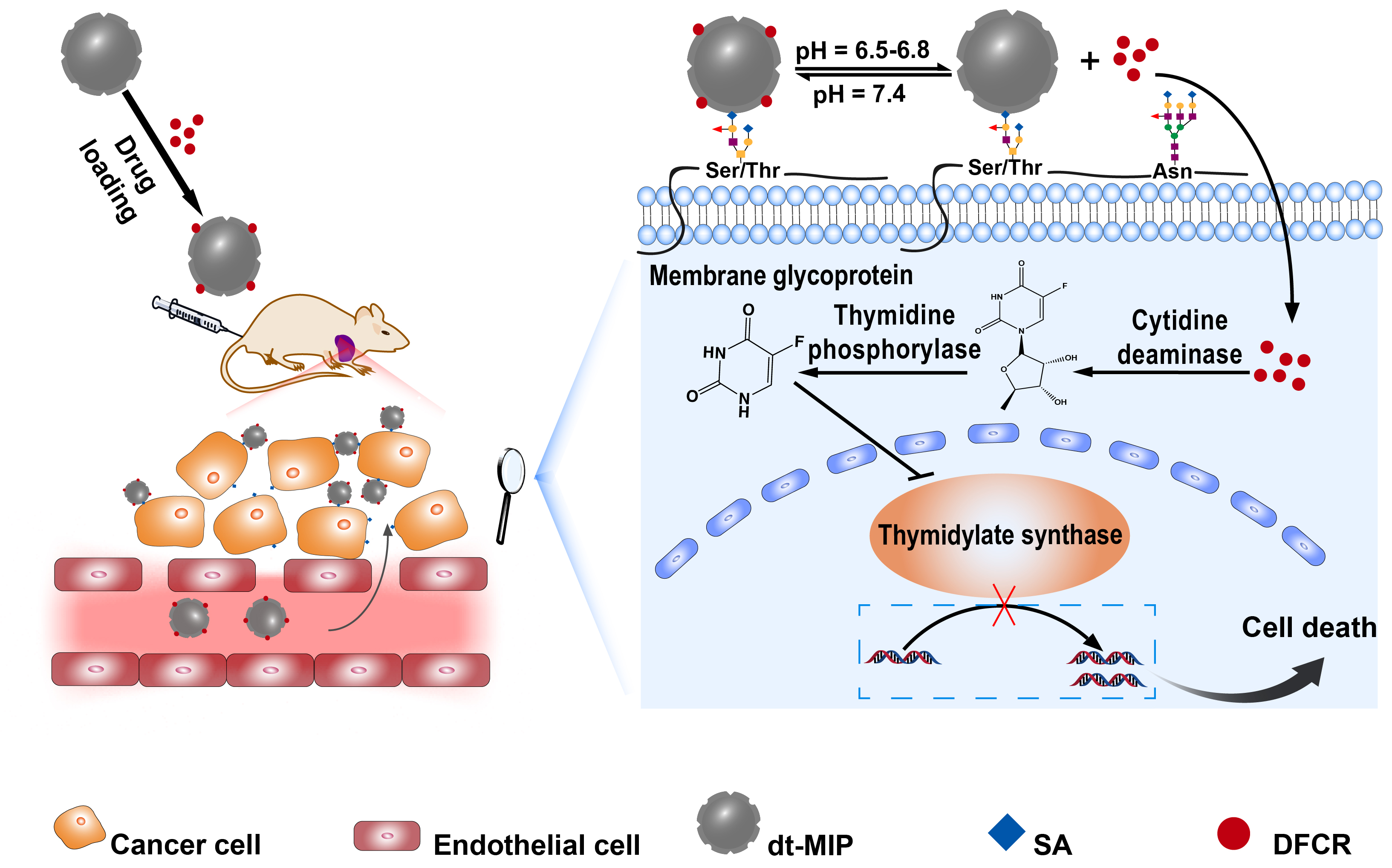 对于MIP的合成,作者利用课题组自主研发的先进印迹技术—硼亲和定向可控表面印迹法(Angew. Chem. Int. Ed., 2015, 54, 10211-10215;Nat. Protocol., 2017, 12, 964–987),将目标前药5-脱氧-5-氟胞苷(DFCR)(卡培他滨的一级代谢产物)和癌症靶标唾液酸(SA)共印迹到纳米粒子上,形成双模板分子印迹聚合物(dt-MIP);当携带了DFCR的dt-MIP到达肿瘤部位时,该纳米载体能通过与SA结合而靶向识别癌细胞,同时长时间保留在肿瘤部位;在该条件下,DFCR缓慢从该载体中释放出来,被癌细胞摄取,经过两部酶转化(胞苷脱氨酶,胸苷磷酸化酶),生成活性分子5-氟尿嘧啶(FU),诱导癌细胞死亡(原理见图1)。