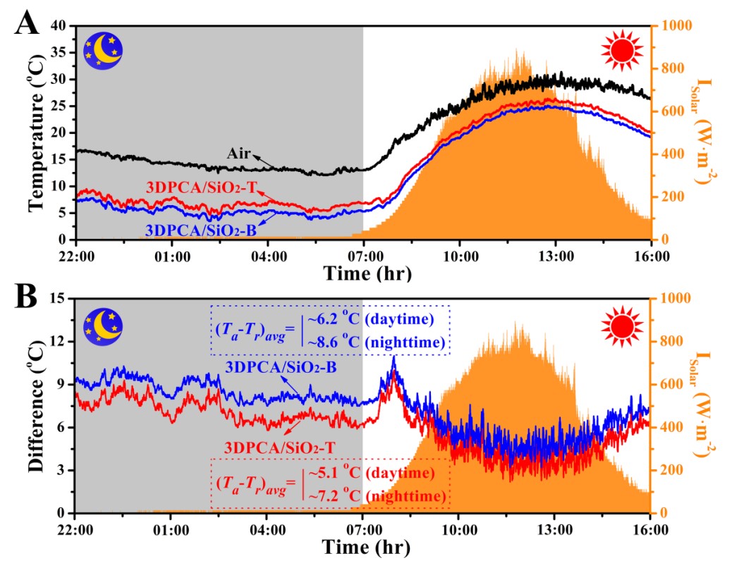 由于独特的三维结构,该复合纤维膜呈现出优异的光学性能,如图3A所示。微米尺度的三维孔结构使纤维膜两侧的太阳光反射率均高达96~97%,且SiO2微球的单面定向富集,有效提升了复合纤维膜的红外发射率(高达95%),远高于未富积SiO2微球的一面(83%)。特别是太阳光反射率高于当前国际最新报道值,达到国际领先水平。基于反射光谱数据,研究团队进一步开展了理论降温功率计算,在不考虑非辐射传热(即不含热传导和热对流)影响的前提下,夜间的理论降温值高达~28 ?C,白天太阳光照下的理论降温值高达~18 ?C(图3B-F)。即使将高达6.9 W·m-2·K-1的非辐射传热系数考虑在内,夜间和白天的理论降温功率也分别高达~11 ?C和~7 ?C。通过户外试验,再次验证了复合纤维膜优异的辐射降温性能。从图4可以看出,纤维膜在夜间可获得~8 ?C的降温效果,即使在白天光功率值高达900 W·m-2的强烈太阳光照下,也能达到6.2 ?C的降温效果。
