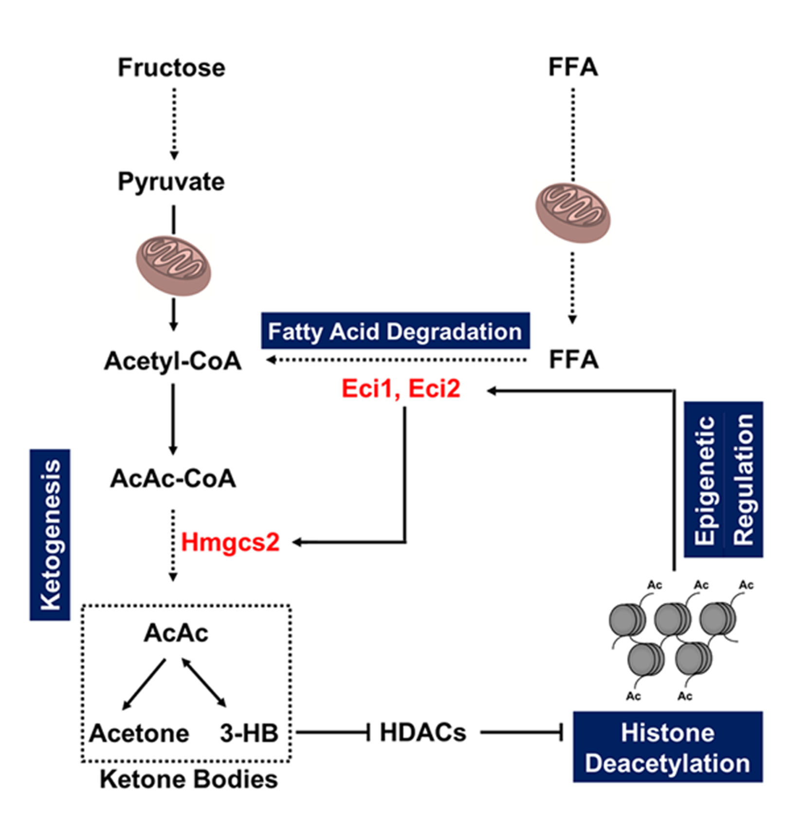重要的是,与正常组相比,酮体生成的核心限速酶3-羟基-3-甲基戊二酰辅酶A合酶2(Hmgcs2)在建模第8周开始显著增加。然而,在Hmgcs2小干扰RNA(siRNA)转染的分化足细胞和肾特异性Hmgcs2敲低小鼠的肾小球中,β-羟基丁酸(3-HB)水平降低并且组蛋白去乙酰化酶(HDAC)活性显著提高,而组蛋白H3和H4的乙酰化显著下调。这些结果表明Hmgcs2调控3-HB以影响脂肪酸降解相关酶变化,从而导致在高果糖诱导足细胞损伤过程中线粒体失调。出乎意料的是,该研究还发现通过RNA干扰敲低Eci1或Eci2可显著抑制足细胞模型中Hmgcs2增加,提示酮体生成中关键酶的表达可能受脂肪酸降解途径的调控;而Eci1或Eci2的下调可有效逆转高果糖诱导的足细胞线粒体功能障碍。因此,该研究揭示了一种表观遗传修饰介导的正反馈机制,其中包含酮体生成和脂肪酸降解,及其在高果糖诱导的足细胞损伤过程中调节线粒体代谢重编程。