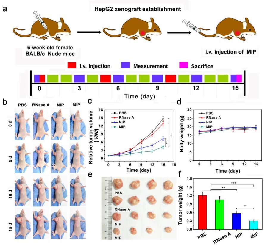 最后,作者通过荷瘤小鼠体内模型表明SA印迹的 NIR797RNase A@BS-NPs能够靶向肿瘤组织并且在肿瘤部位有效积累(图4). 研究也发现SA印迹的RNase A@BS-NPs具有良好的体内治疗效果,同时,小鼠的体重监测数据也表明了该纳米载体具有较高的生物安全性(图5)。