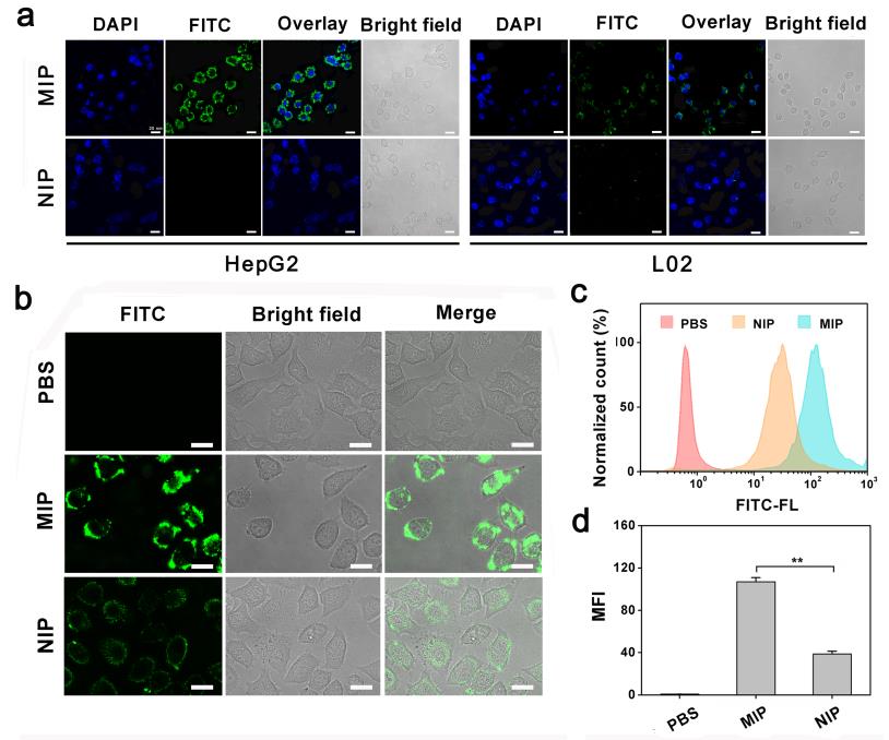 蛋白质疗法是指基于外源蛋白质或多肽等生物分子而实现细胞生物学功能的调控、疾病的治疗等作用。相比于基因/化学治疗,蛋白质疗法不会引起永久性的基因改变和严重的不良反应。这样,蛋白质疗法在抗肿瘤治疗领域有着不可替代的地位。然而,由于蛋白质自身的独特属性,比如:大尺寸、亲水性、膜不通透性和易降解等特点。迄今为止,所有临床批准的蛋白质药物靶点仅限于细胞外环境中的配体或细胞表面的疾病靶点。考虑到人类~70%的蛋白质是在细胞内的事实,近年来一些纳米载体(脂质体、聚合物,纳米材料等)已被开发用于蛋白质胞内传递。但如何实现高效的细胞内蛋白传递仍然存在一些挑战:1)传统的传递以细胞胞吞方式进入细胞,但是大多数蛋困于溶酶体中,导致蛋白降解失活; 2) 载体进入细胞内靶点,如何有效的释放活性蛋白药物也是一个难点。因此,迫切需要开发在生物学条件下可以将蛋白质有效递送至细胞内的稳定载体系统。研究表明,分子印迹聚合物(MIP)是一个有潜力的纳米载体,但目前用于靶向细胞内蛋白传递尚未报道。