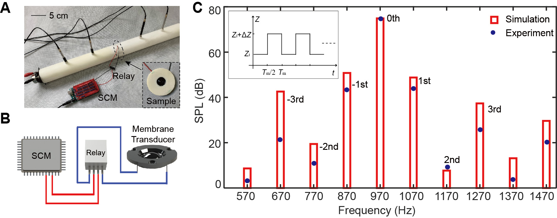 为具体实现所提出的时变超材料,我们利用动圈式电声换能器的电磁-声场耦合特性,构建了可通过外电路调控的声阻抗单元。通过继电器控制其回路的通断,即可对该超材料单元的阻抗特性实现快速、任意的调制。如图2所示,通过阻抗管测量证明了该机制可以有效地将入射声波能量转换到其他谐波。