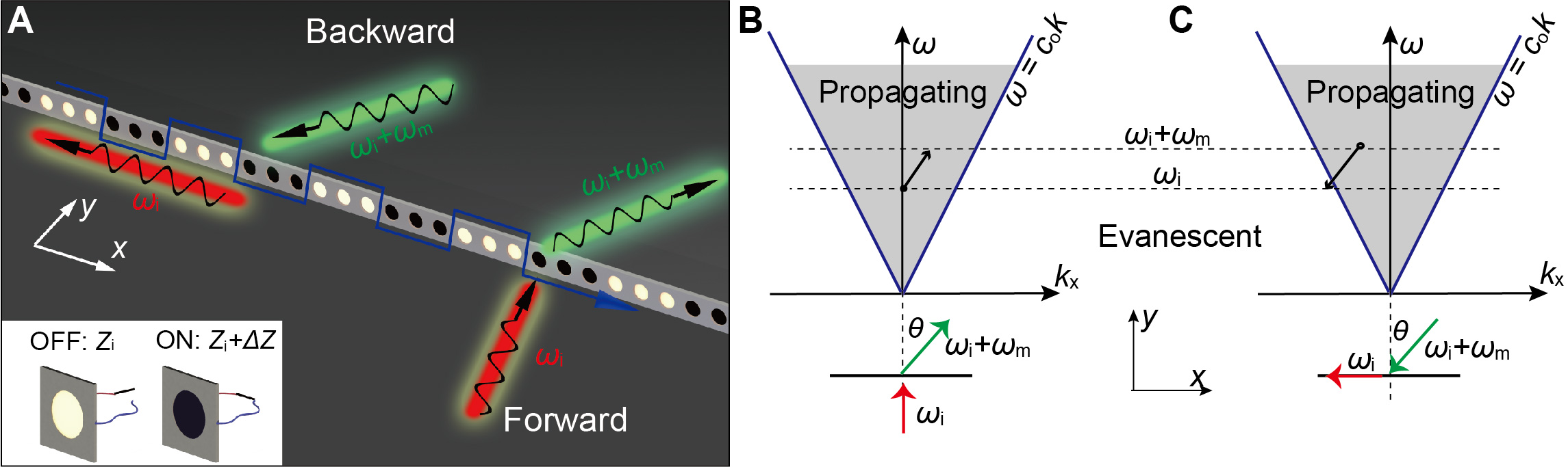 图1 时空调制实现非互易声波传输。(A)基于时空调制声学超表面实现声波的非互易传输。(B)正向传播时,+1次谐波沿角度θ折射。(C)反向传输时,−1次谐波变回原来入射波的频率,但不再沿原路径返回,而是变成倏逝波。