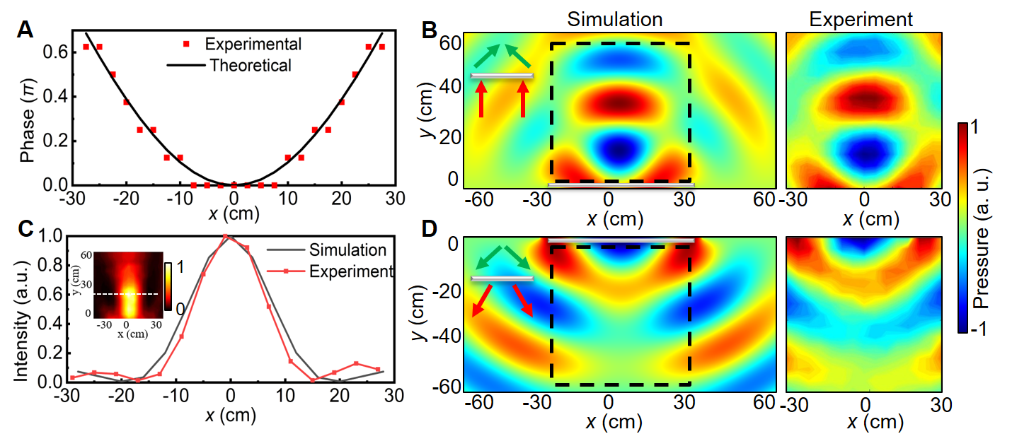 图4 单向蓝移声聚焦。(A)声学超材料时空调制的初始相位的空间分布。(B)正向传播时,1000Hz的基波垂直入射后在透射侧实现了1100Hz谐波的聚焦。(C)焦平面位置处1100Hz声波的强度分布。(D)反向过程中,入射的1100Hz点声源经过超材料后产生1000Hz的透射声波并继续发散。