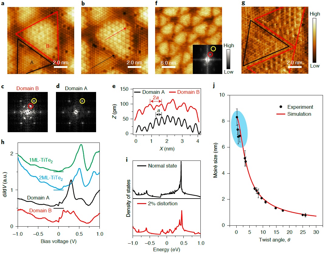 图2:接近0°转角时莫尔条纹上的强CDW态。(a, b) 正负偏压下一个莫尔原胞的STM图;(c, d) 区域B(电荷密度波态)和区域A(正常态)的快速傅里叶变换图;(e) 沿着形貌图b中红线和黑线的线扫描结果;(f, g) 室温下的STM形貌图;(h) 不同情况下的dI/dV谱;(i) 密度泛函理论计算的局域态密度结果;(j)角度依赖的莫尔周期实验结果。