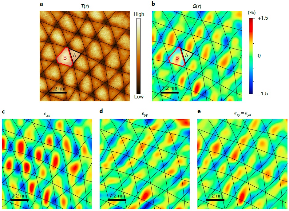 图3:0°转角附近的应力分布。(a) STM形貌图;(b) 对称化应力图;(c-e) 由几何相位分析得到的应力分量。