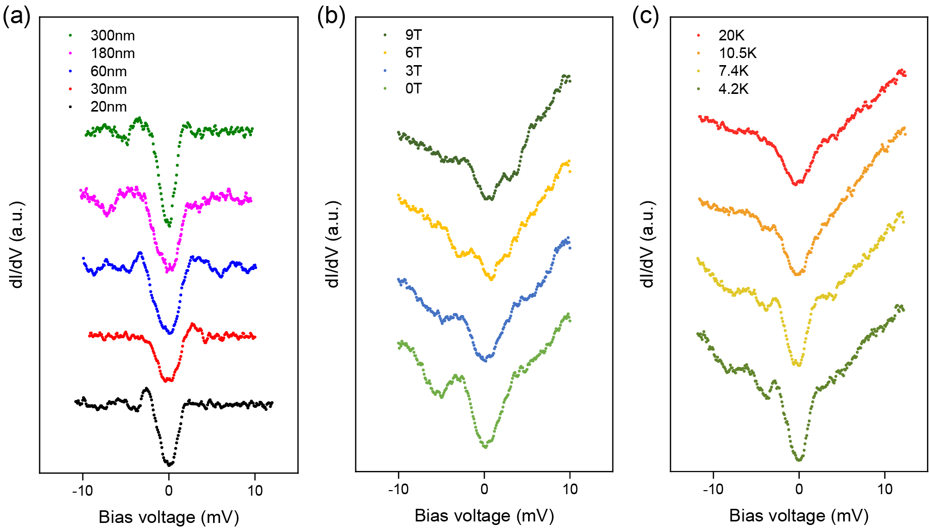 图2. Bi2Se3/FST异质结构的STS表征。(a) 不同厚度的Bi2Se3/FST异质结构的归一化dI/dV光谱。(b) 异质结构的原始dI/dV光谱在不同磁场下的演变。(c) 漂移校正后的dI/dV光谱的温度依赖性。(b)和(c)中Bi2Se3薄膜的厚度为20nm。U = +10 mV,It = 200 pA,Umod = 0.2 mV。